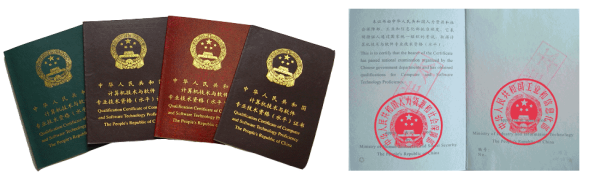 培訓(xùn)證書 考試合格者將頒發(fā)由中華人民共和國人力資源和社會保障部統(tǒng)一印制,人力資源和社會保障部、工業(yè)和信息化部共同用印的《中華人民共和國計算機專業(yè)技術(shù)資格(水平)證書》