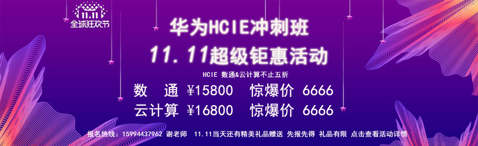 活動(dòng)對(duì)象:各高校學(xué)生群體與社會(huì)人士 活動(dòng)時(shí)間:2019年10月28日 – 2019年11月11日 活動(dòng)內(nèi)容:數(shù)通&云計(jì)算HCIE鉅惠6666元 如果您還在為HCIE高昂的學(xué)習(xí)費(fèi)用而煩惱,如果您還在猶豫是否要給自己一次突破自我的機(jī)會(huì)。凡是在2019年10月28日至2019年11月11日?qǐng)?bào)名的學(xué)員,即可享受帆聯(lián)科技.華為授權(quán)培訓(xùn)中心歷史折扣最低價(jià)!全年僅此一次的機(jī)會(huì)請(qǐng)您千萬(wàn)不要錯(cuò)過(guò),帆聯(lián)科技.華為授權(quán)培訓(xùn)中心推出雙十一鉅惠活動(dòng),華為數(shù)通HCIE與華為云計(jì)算HCIE培訓(xùn)費(fèi)均為6666 元!機(jī)不可失,失不再來(lái), 給自己一個(gè)成長(zhǎng)的機(jī)會(huì)。 如此具有誘惑力的價(jià)格,您還在猶豫嗎?如果您還在猶豫,那么接下來(lái)還有第二重大禮等著你。敲黑板:請(qǐng)大家仔細(xì)聽(tīng)好了,凡是在2019年11月11日活動(dòng)結(jié)束前,前三位報(bào)名成功的學(xué)員,即可領(lǐng)取由帆聯(lián)科技.華為授權(quán)培訓(xùn)中心送出的考試大禮包一份(小米手環(huán)4或榮耀無(wú)線路由器2S),此禮包數(shù)量有限,先報(bào)先得! 注意事項(xiàng): 1、 本次活動(dòng)優(yōu)惠價(jià)僅針對(duì)沖刺考取HCIE的學(xué)員朋友。 2、 本次報(bào)名費(fèi)不包含(HCIA、HCIP)理論課程學(xué)習(xí)的費(fèi)用。 3、 本次沖刺班是針對(duì)直接進(jìn)行HCIE筆試 + LAB指導(dǎo) + 面試指導(dǎo)的考生,助力學(xué)員沖刺HCIE考試。 4、 凡是報(bào)班成功的學(xué)員,應(yīng)該具備如下條件: (1)具有良好的理論基礎(chǔ)(HCIA或HCIP的理論水平); (2)具有良好的面試表達(dá)能力; (3)具有較好的抗壓能力,能應(yīng)對(duì)考試較大的復(fù)習(xí)壓力; 5、本次活動(dòng)的解釋權(quán)歸帆聯(lián)科技.華為授權(quán)培訓(xùn)中心所有。 附: HCIE考試流程 1、 在帆聯(lián)科技.華為授權(quán)培訓(xùn)中心報(bào)名成為HCIE內(nèi)部學(xué)員。 2、 獲取筆試考試復(fù)習(xí)資料,在帆聯(lián)科技.華為授權(quán)培訓(xùn)中心預(yù)約筆試考試。 3、通過(guò)筆試考試后,進(jìn)入由老師一對(duì)一指導(dǎo)的“HCIE LAB集訓(xùn)營(yíng)”中進(jìn)行LAB集訓(xùn)。 4、經(jīng)過(guò)老師評(píng)估,達(dá)到LAB考試標(biāo)準(zhǔn)后,預(yù)約華為深圳考場(chǎng)的LAB考試。 5、通過(guò)LAB考試后,進(jìn)入由老師一對(duì)一指導(dǎo)的“HCIE面試集訓(xùn)營(yíng)”中進(jìn)行面試集訓(xùn)。 6、經(jīng)過(guò)老師評(píng)估,達(dá)到面試考試標(biāo)準(zhǔn)后,預(yù)約華為深圳考場(chǎng)的面試考試。 7、順利通過(guò)HCIE考試。